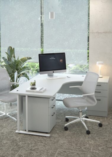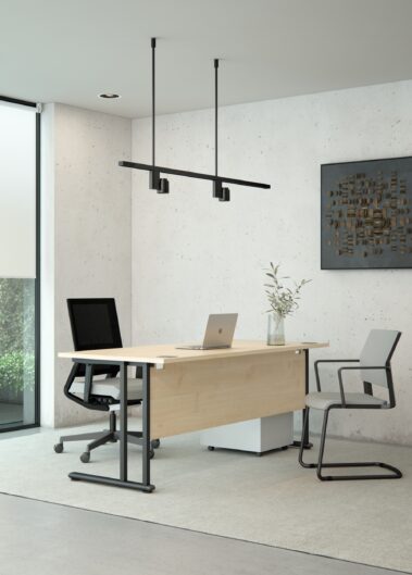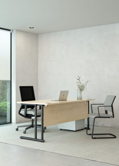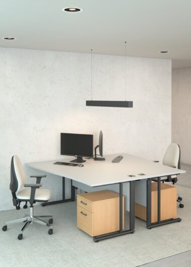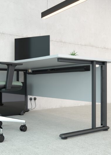Alpha Premium delivers a contemporary solution offering a Rectangular, Crescent or Wave desk with a robust double upright cantilever frame and the option to add a cable management solutions.